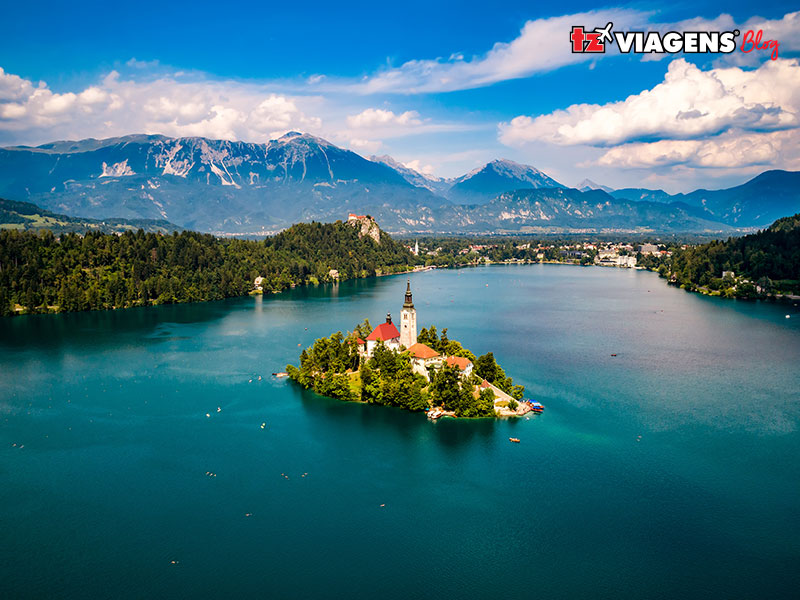 O esverdeado Lago Bled reflete a imagem de uma pequena ilha no centro, onde se ergue a Igreja da Assunção de Maria, acessível apenas por barco.