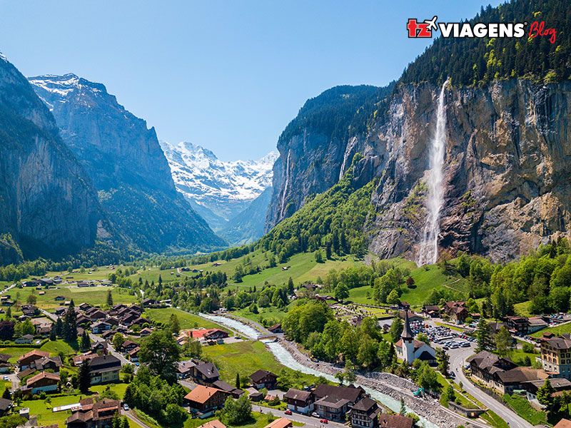 O nome da cidade significa “muitas fontes”, e não é exagero: há 72 quedas d’água registradas nos arredores. A mais conhecida é a Staubbach Falls, que despenca de quase 300 metros de altura e pode ser vista de praticamente qualquer ponto da vila.