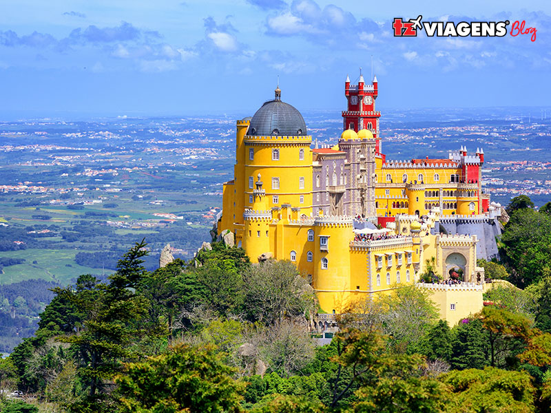 O Palácio Nacional da Pena tem torres coloridas e influências manuelinas e mouriscas. Logo abaixo, o Castelo dos Mouros, do século IX, oferece uma vista ampla da região.