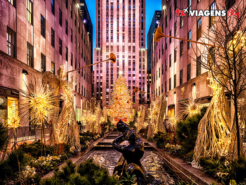 A árvore do Rockefeller Center, com mais de 25 metros e milhares de luzes, é o ponto central da festa. Logo ao lado, a pista de patinação mais famosa do mundo recebe visitantes até tarde da noite.