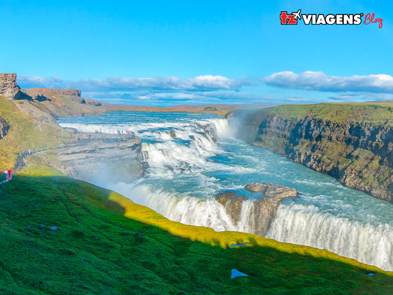 Por sua vez, Gullfoss encerra essa tríade clássica. A cachoeira é alimentada por águas glaciais, despencando em dois níveis e produzindo uma cena poderosa — sobretudo quando a névoa forma arco-íris sobre o cânion.